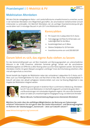 „Mobilität gewinnt gerade im ländlichen Raum zunehmend an Bedeutung. Altenbeken hat 2017 die erste Mobilstation im Hochstift eingeweiht und damit die guten Bahn- und Busanbindungen mit individuellen Angeboten ergänzt. Als naturnahe Gemeinde setzen wir dabei auf umweltverträgliche Energiegewinnung und elektrische Antriebe.“