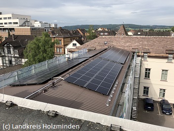 Die neue Solaranlage versorgt sowohl das eigentliche Kreisverwaltungsgebäude in der Bürgermeister-Schrader-Straße als auch die Kreisvolkshochschule in der Neuen Straße sowie das Gesundheits- und Sozialgebäude in der Böntalstraße mit Strom. „Das Gute dabei ist, dass die Energie genau dann anfällt, wenn sie gebraucht wird“, unterstreicht Dr. Linda Hartmann, Klimaschutzmanagerin des Landkreises Holzminden. Denn die Solaranlagen erzeugen ihre Energie tagsüber, wenn in den Verwaltungsräumen Hochbetrieb herrscht und die PC´s angeschaltet sind. Anders als bei privaten Anlagen werde deshalb auch keine Speichertechnologie benötigt. Und selbst an Wochenenden, wenn keiner da ist, werde die vorhandene Grundlast durch Server und ähnliche Technologien über das Dach abgedeckt. „Die Hälfte unseres Strombedarfs fällt allein schon an, ohne dass jemand einen Rechner anschaltet“, erklärt Helmut Meier, Bereichsleiter der Gebäudewirtschaft, „durch die Anlage sparen wir jährlich je nach Witterung circa 7.000 Euro an Stromkosten.“ Über die gesamte Lebensdauer einer solchen Anlage gerechnet seien das 140.000 Euro, so Meier. Auch für dieses Projekt sind überdies Fördermittel beantragt worden.